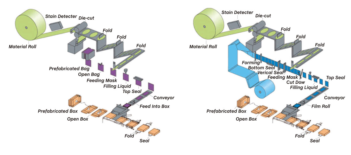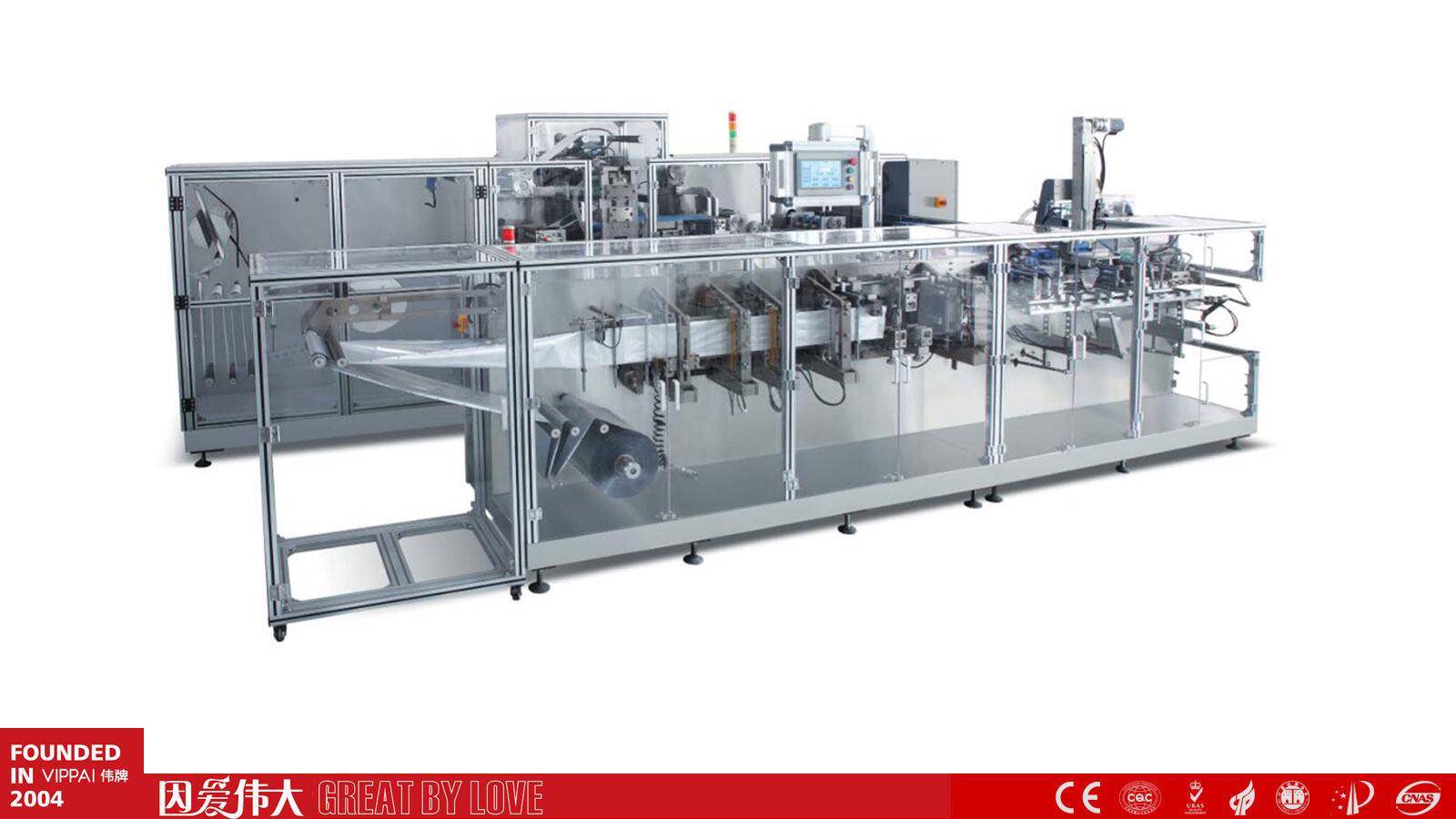 VPD400全自動面膜包裝機(在線裝袋) 滿足醫藥級GMP生產設備要求,只需卷膜進料即可完成切膜成型、面膜折疊、在線制袋(或預制袋)、面膜入袋、添加液體、熱封成袋等步驟,末端產出成品。